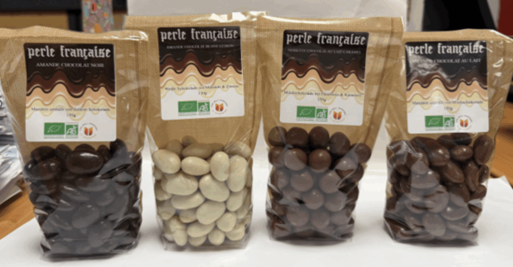 Perle Francaise Chocolat ist somit entstanden aus einer vertrauensvollen Partnerschaft zwischen beiden Unternehmen und ist die Kombination aus köstlichen, einzigartigen Schokoladen-Dragees in kleinen vom Endkunden gewünschten Verpackungen und dies in Bio-Qualität. Die Geschmacksrichtungen im Kern des Dragees sind passend gewählte Mandeln oder Haselnüsse. Der Schokoladenüberzug ist fein abgeschmeckt und besteht aus weißer, dunkler oder Milchschokolade.